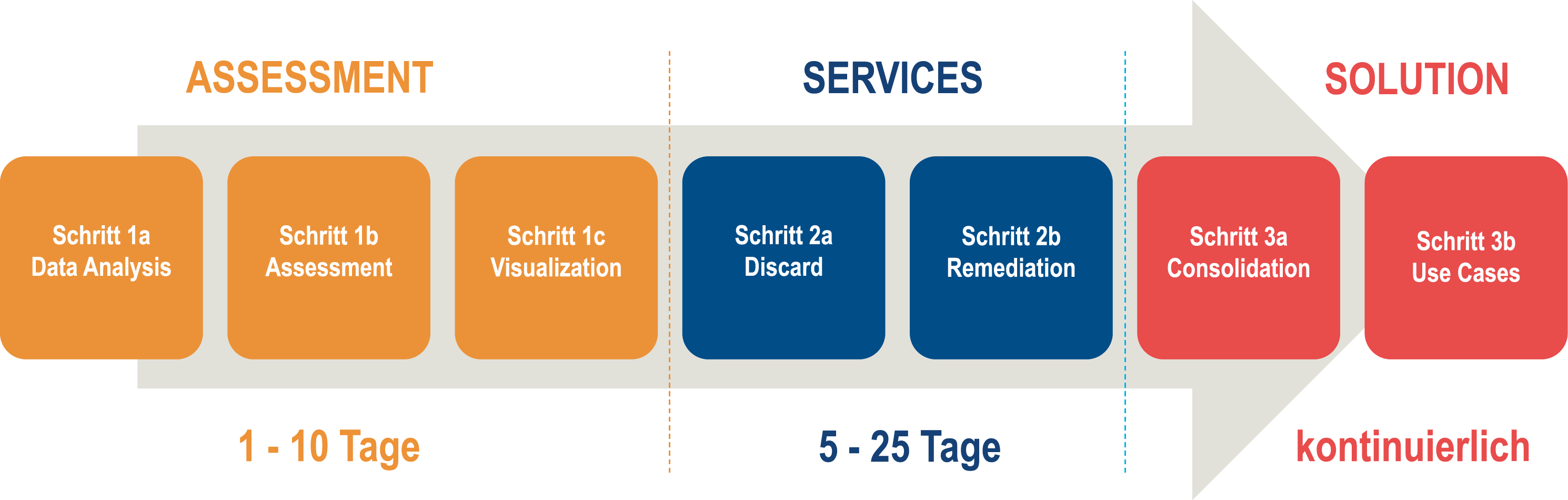 Challengen Sie uns und starten sie mit einem DG360° Data Assessment Basic zum Fixpreis. Mit 2 bis maximal 10 Tagen Consulting Aufwand erstellen wir mit unserer einzigartigen Technologie Transparenz und Kontrolle über ihre Millionen unstrukturierter Datenobjekte.